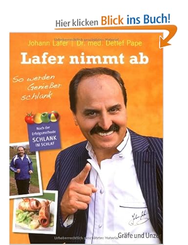 Abnehmen und Genießen müssen kein Widerspruch sein! Der Sternekoch und Feinschmecker Johann Lafer hat geschafft, wovon Viele träumen: Er hat 15 Kilo abgenommen, ohne zu hungern und auf gutes Essen zu verzichten. Begleitet wurde er dabei von Dr. Detlef Pape, dem Autor von Schlank im Schlaf, Deutschlands erfolgreichster Diät. In diesem Buch erfahren Sie mehr über Lafers Erfolgsweg und können gleich mitmachen: Sie finden alles zu seiner Genuss-Diät, detaillierte Sport- und Ernährungspläne und nicht zuletzt Lafers 50 Lieblingsrezepte zum Abnehmen.